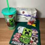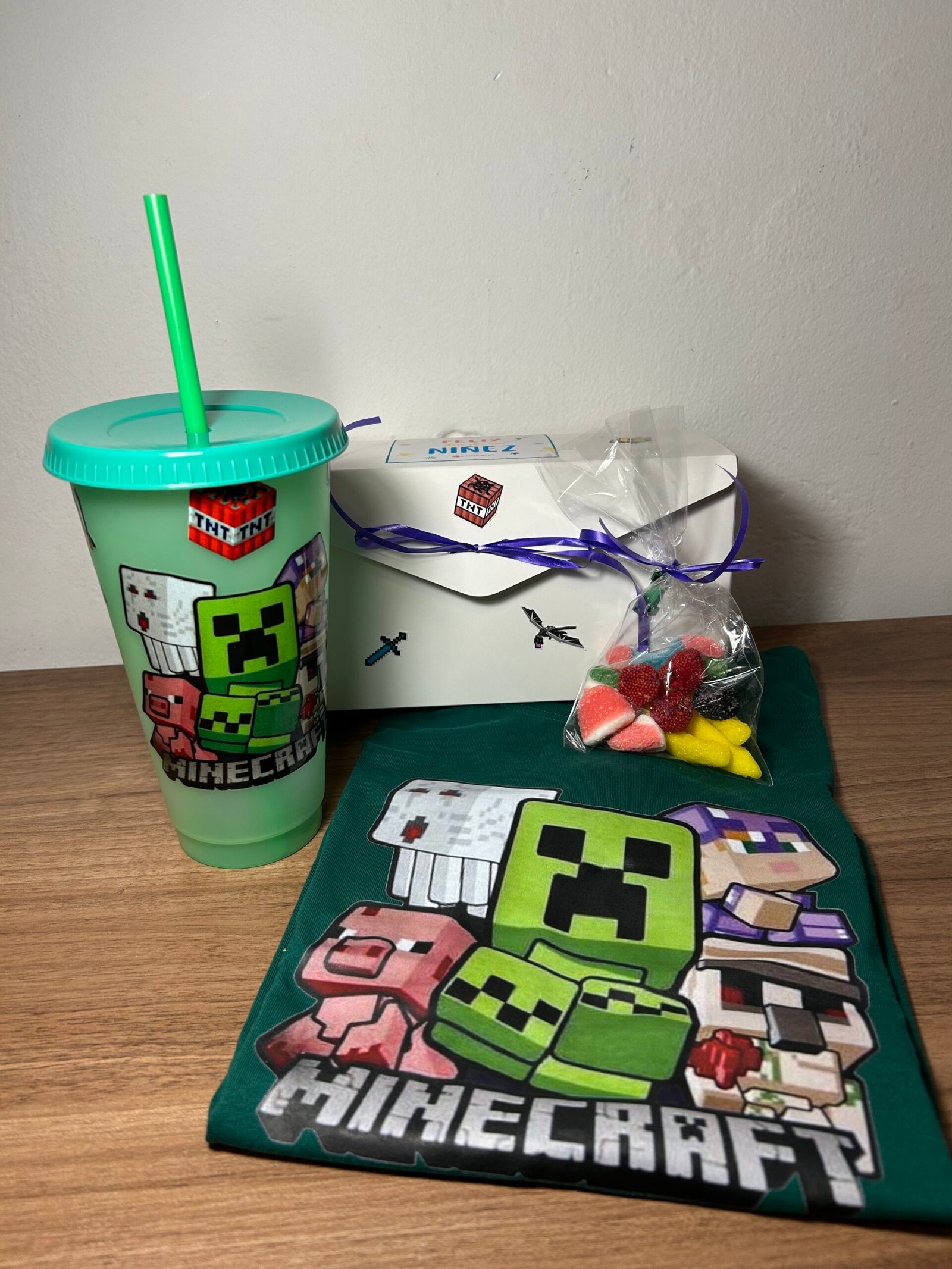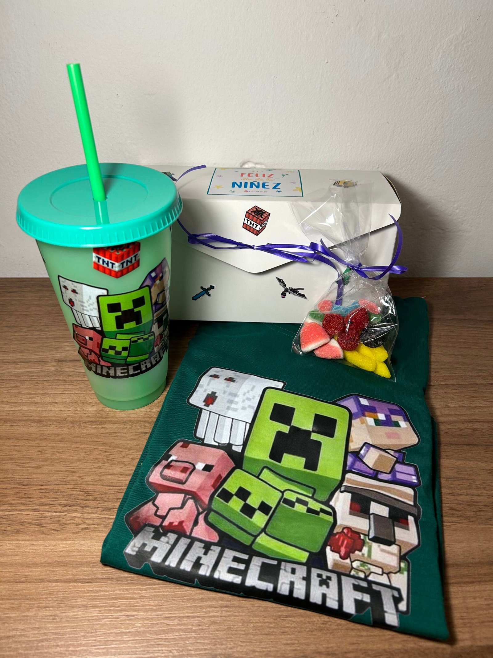 En la cajita viene una remera + un vaso + bolsita de golosina.